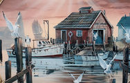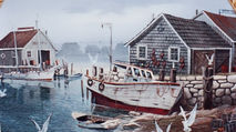 By artist Ben Cannon, this evocative masterpiece transports you to the timeless charm of a rustic fishing village at dusk, where weathered wooden boats bob gently in the sheltered harbor alongside a creaking dock strewn with coiled ropes, barnacle-crusted pilings, and the scattered remnants of the day's catch. Seagulls wheel overhead in lazy spirals, their cries echoing faintly as they settle on buoy markers and mast tops, while the last golden rays of a picturesque sunset bleed across the sky in ribbons of amber, rose, and violet, reflecting like molten glass on the rippling water and gilding the peeling paint of old dories and the salt-bleached planks of the pier. Cannon’s brushwork captures every intimate detail—the subtle play of light on wet sand, the soft haze of woodsmoke rising from a distant cottage chimney, the delicate texture of fishing nets drying in the evening breeze—creating a scene so serene and richly atmospheric that you can almost smell the brine and tar, taste the salt on the air, and feel the profound, restorative peace of a coastal community winding down after another day danced with the sea.